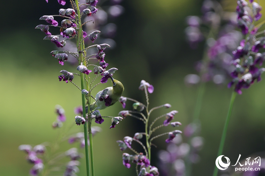 A white-eye bird forages among the flowers in Wenbita Park in Tongan district of Xiamen, southeast China’s Fujian Province. (People’s Daily Online/Chen Bo)
