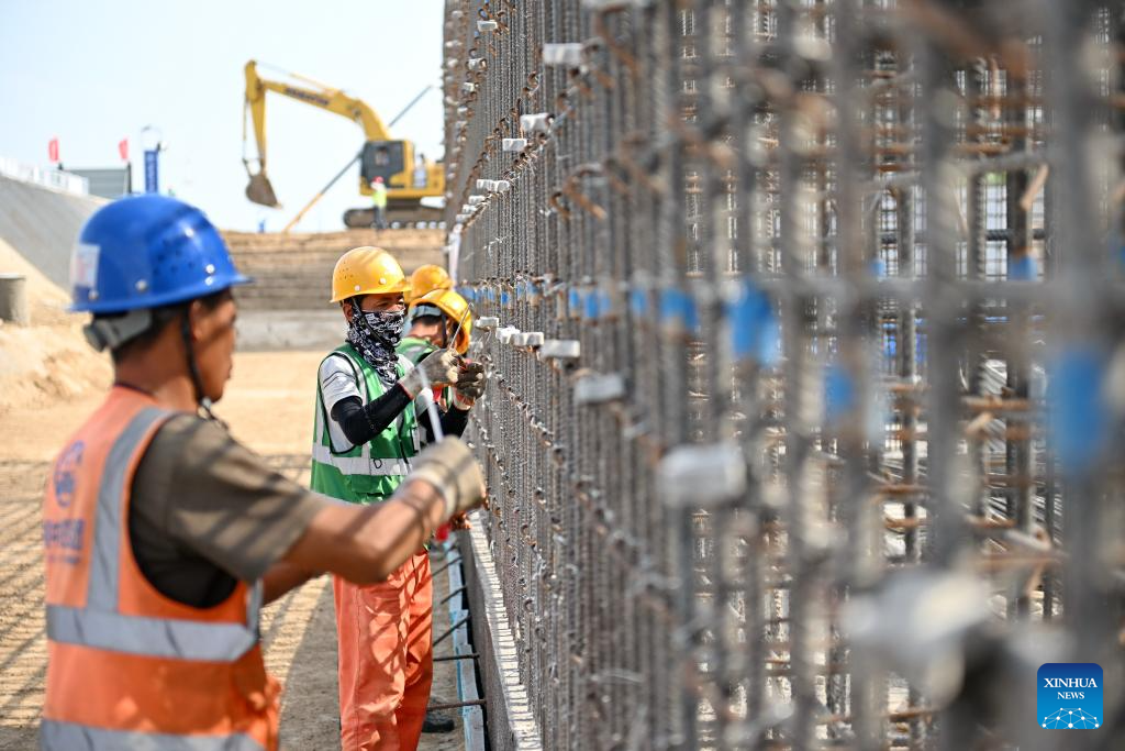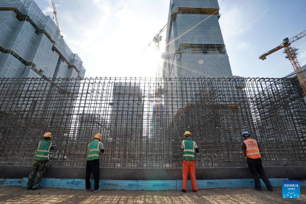 Workers are seen at a construction site in Xiong'an New Area, north China's Hebei Province, June 26, 2024. Construction sites in Xiong'an New Area have taken various measurements to help workers stay cool in the summer heat. (Xinhua/Mu Yu)