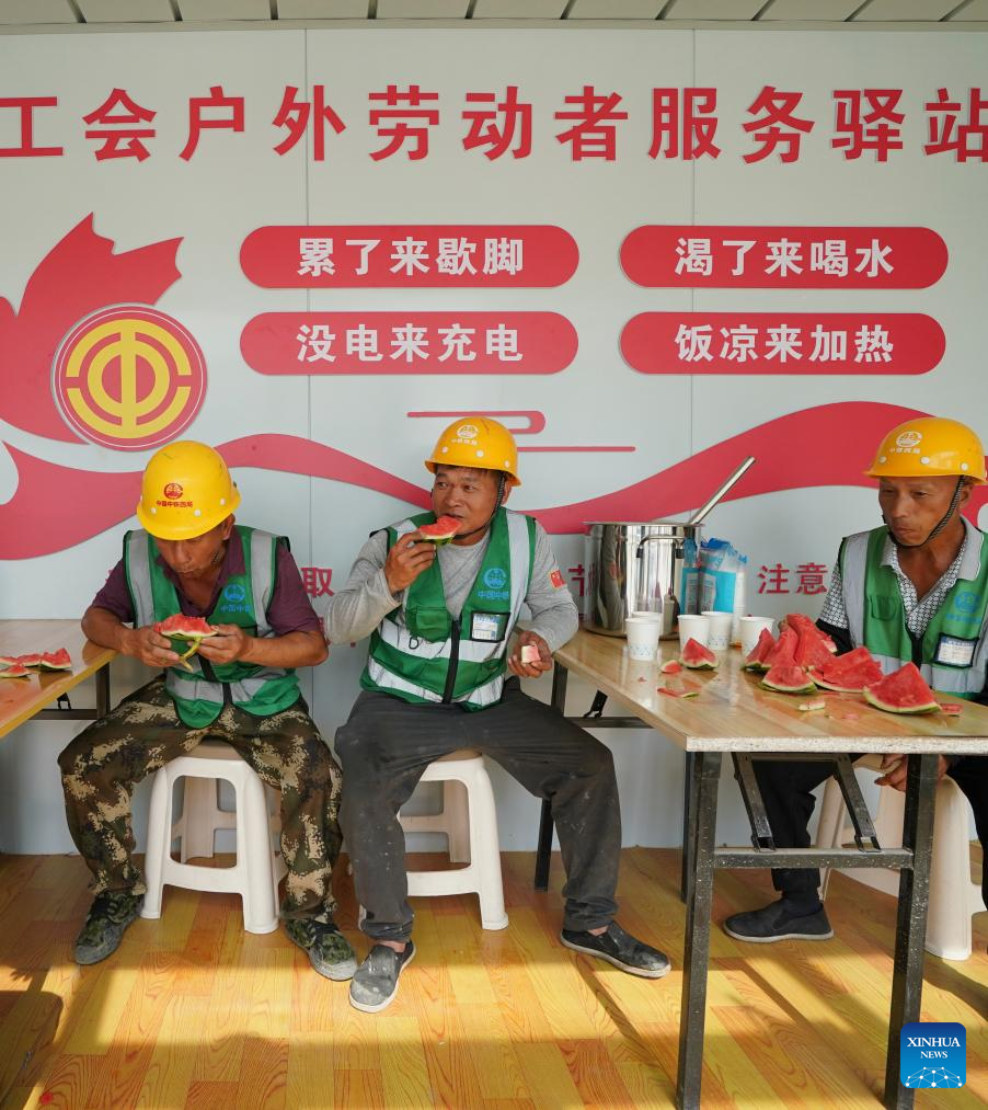 Workers have watermelon as a summer refreshment in Xiong'an New Area, north China's Hebei Province, June 26, 2024. Construction sites in Xiong'an New Area have taken various measurements to help workers stay cool in the summer heat. (Xinhua/Mu Yu)