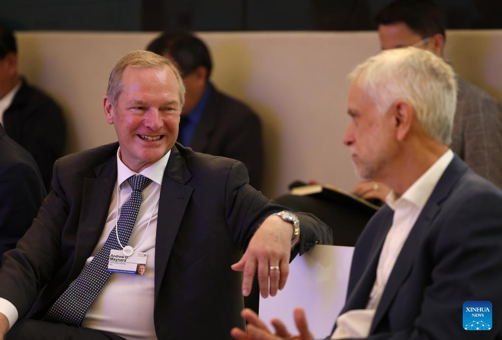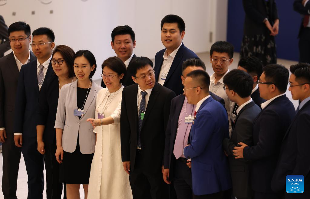 Participants chat during the 15th Annual Meeting of the New Champions, also known as the Summer Davos, at the Dalian International Conference Center in Dalian, northeast China's Liaoning Province, June 25, 2024. Featuring the theme "Next Frontiers for Growth," the event, held from June 25 to 27, gathers over 1,700 leading figures from the public and private sectors in more than 100 countries and regions to jointly explore new drivers and pathways for global economic growth. (Xinhua/Yao Jianfeng)