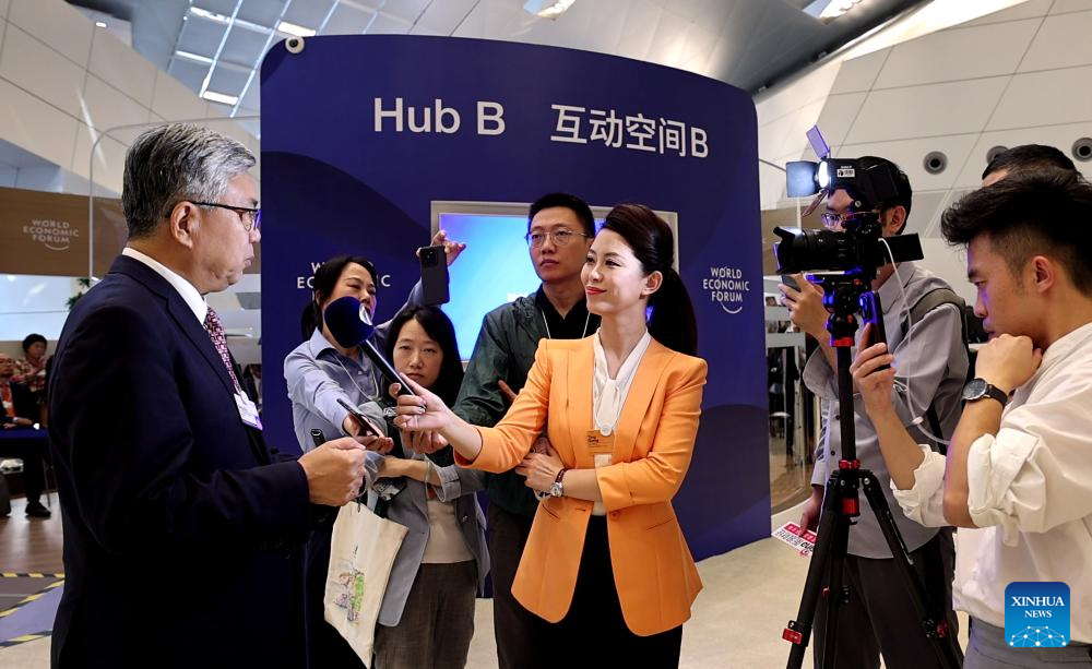 Journalists interview a participant during the 15th Annual Meeting of the New Champions, also known as the Summer Davos, at the Dalian International Conference Center in Dalian, northeast China's Liaoning Province, June 25, 2024. Featuring the theme "Next Frontiers for Growth," the event, held from June 25 to 27, gathers over 1,700 leading figures from the public and private sectors in more than 100 countries and regions to jointly explore new drivers and pathways for global economic growth. (Xinhua/Yao Jianfeng)