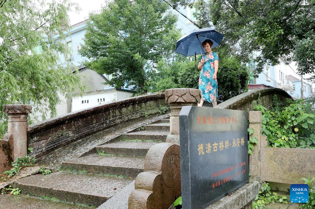 A woman walks on the Yong'an Bridge in Xiayang Village of Deqing County, east China's Zhejiang Province, June 25, 2024. Deqing County is home to seven ancient stone bridges which are listed as major cultural heritage sites under state-level protection. In recent years, the county has spared no effort in the protection and renovation of ancient stone bridges, while promoting the integration of its heritage resources with cultural tourism and research trips. (Photo by Xie Shangguo/Xinhua)