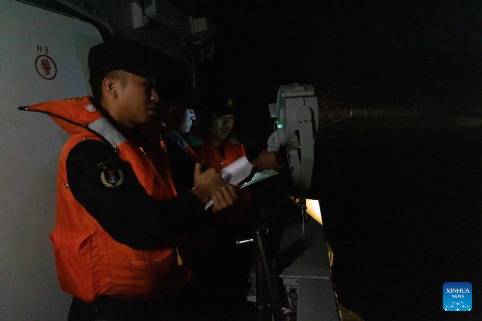 Chinese sailors send light signals during the 36th joint patrol of Chinese and Vietnamese navies in Beibu Gulf in the South China Sea, June 26, 2024. (Photo by Tong Jiajun/Xinhua)