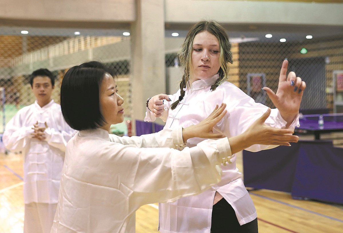 Wang Juan, a PE teacher at the Beijing Foreign Studies University, shows baduanjin exercise movements to US student Emma Monday at the university on May 20. (ZOU HONG/CHINA DAILY)