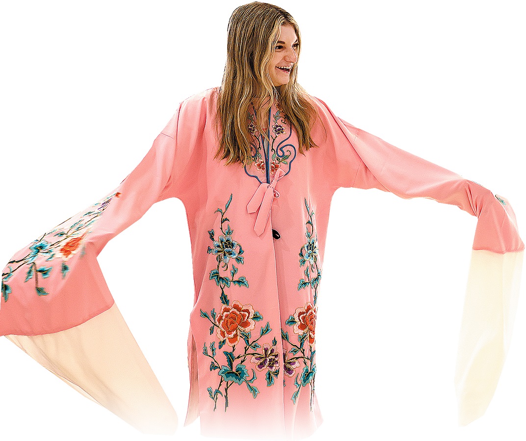A student from Indiana University of Pennsylvania tries on Peking Opera costumes at Jixiang Theatre in Beijing on May 17. (ZOU HONG/CHINA DAILY)