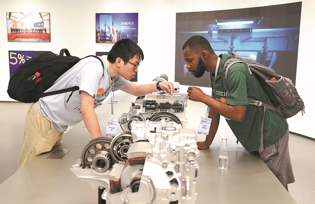 Kenneth Au (left) and Kamir Walton (right) from Indiana University of Pennsylvania learn about car engine components while visiting Xiaomi's industrial park in Beijing on May 20. (ZOU HONG/CHINA DAILY)