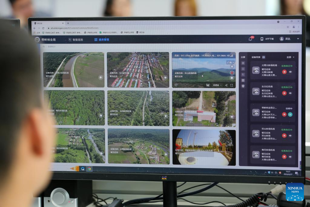 A staff member monitors drones for forest patrolling at the control room of Dailing forestry bureau in Yichun, northeast China's Heilongjiang Province, June 27, 2024. Recently, the Dailing forestry bureau has integrated advanced technology to enhance forestry management. By deploying drones, the bureau has achieved intelligent and automated forest patrolling, significantly reducing disaster risks and improving patrol efficiency. (Xinhua/Wang Yiliang)