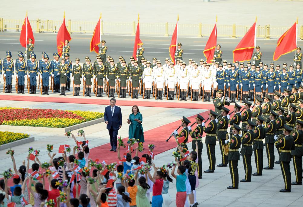 Chinese President Xi Jinping holds a welcome ceremony for Peruvian President Dina Ercilia Boluarte Zegarra, who is on a state visit to China, at the square outside the east gate of the Great Hall of the People prior to the talks between Xi and Boluarte, in Beijing, capital of China, June 28, 2024. Xi held talks with Boluarte at the Great Hall of the People in Beijing on Friday. (Xinhua/Liu Weibing)