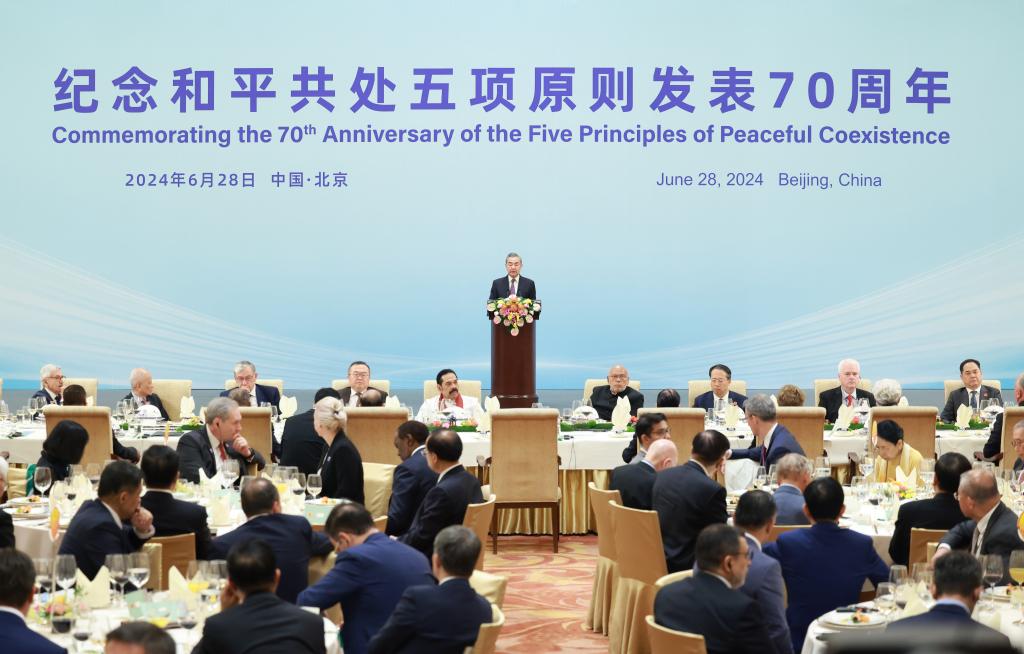 Chinese Foreign Minister Wang Yi, also a member of the Political Bureau of the Communist Party of China Central Committee, attends and addresses a luncheon commemorating the 70th anniversary of the Five Principles of Peaceful Coexistence in Beijing, capital of China, June 28, 2024. (Xinhua/Wang Ye)