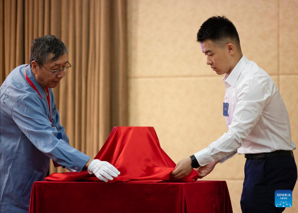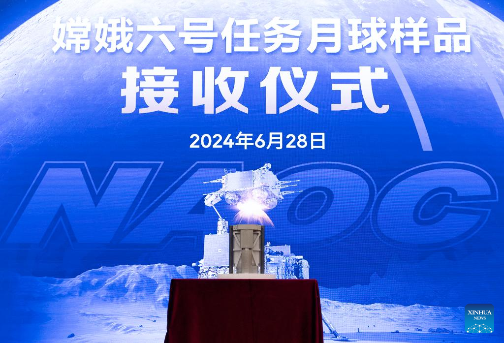 A reception ceremony for Chang'e-6 lunar samples is held at the National Astronomical Observatories under the Chinese Academy of Sciences (CAS) in Beijing, capital of China, June 28, 2024. A ceremony was held on Friday at the National Astronomical Observatories under the CAS to receive the lunar samples collected by China's Chang'e-6 probe. China's Chang'e-6 mission collected 1,935.3 grams of samples from the moon's far side, the China National Space Administration announced on Friday. (Xinhua/Jin Liwang)