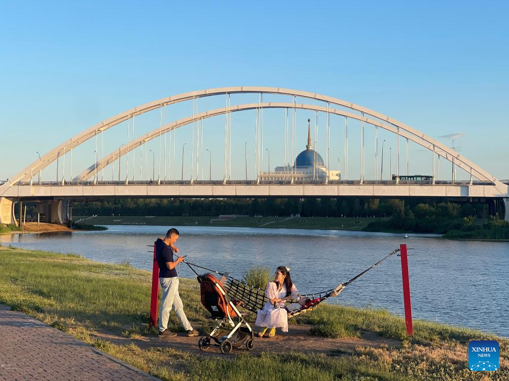 People enjoy their leisure time by the Ishim River in Astana, Kazakhstan, June 29, 2024. (Xinhua/Yue Yuewei)