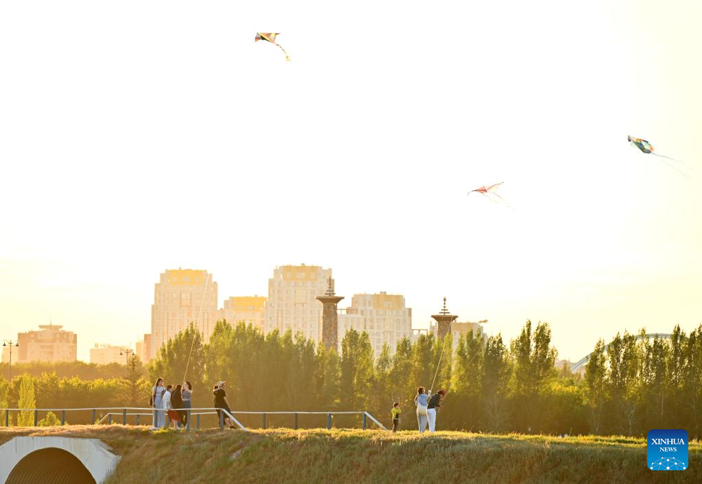 People fly kites at a park by the Ishim River in Astana, Kazakhstan, June 29, 2024. (Xinhua/Yue Yuewei)