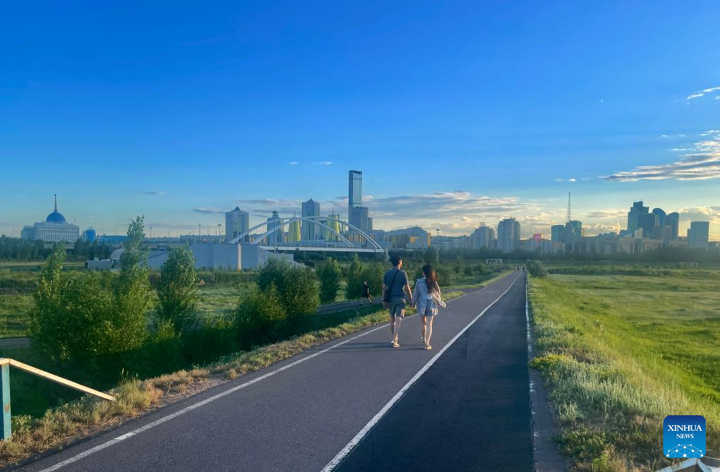 People take a walk at a park with the city's skyline in the background in Astana, Kazakhstan, June 29, 2024. (Xinhua/Zhai Jianlan)