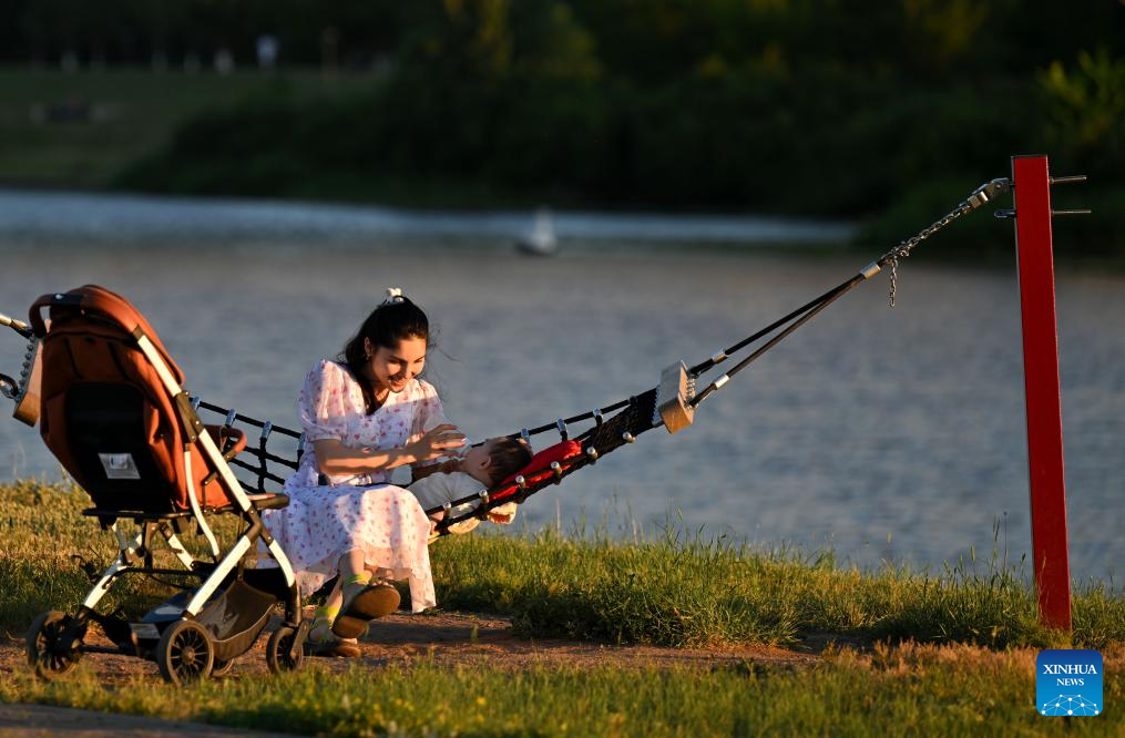 People enjoy their leisure time by the Ishim River in Astana, Kazakhstan, June 29, 2024. (Xinhua/Zhai Jianlan)