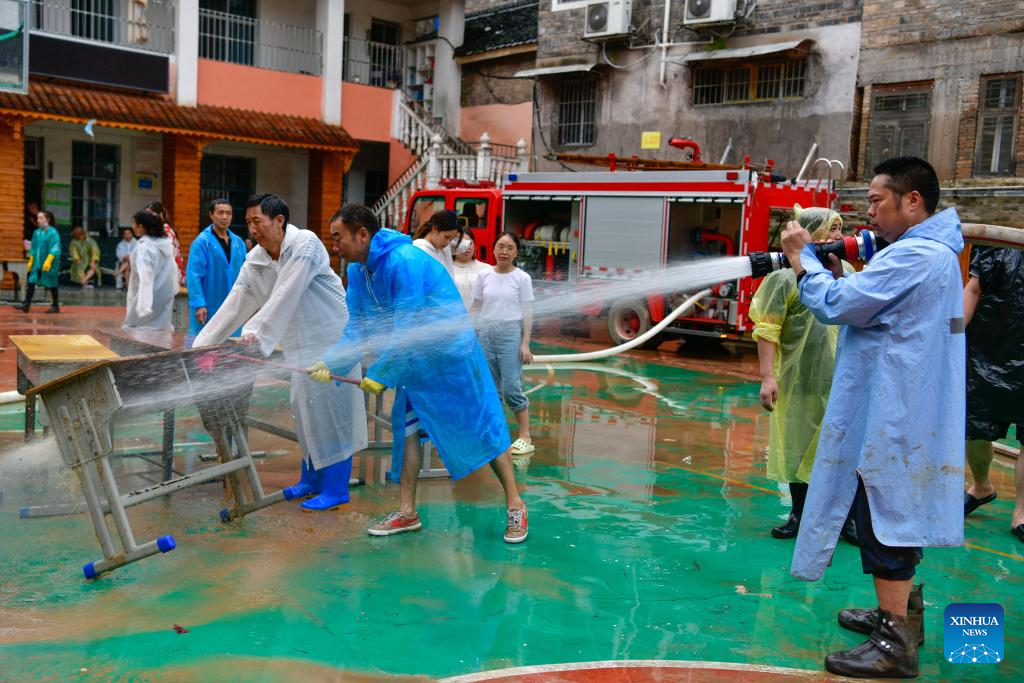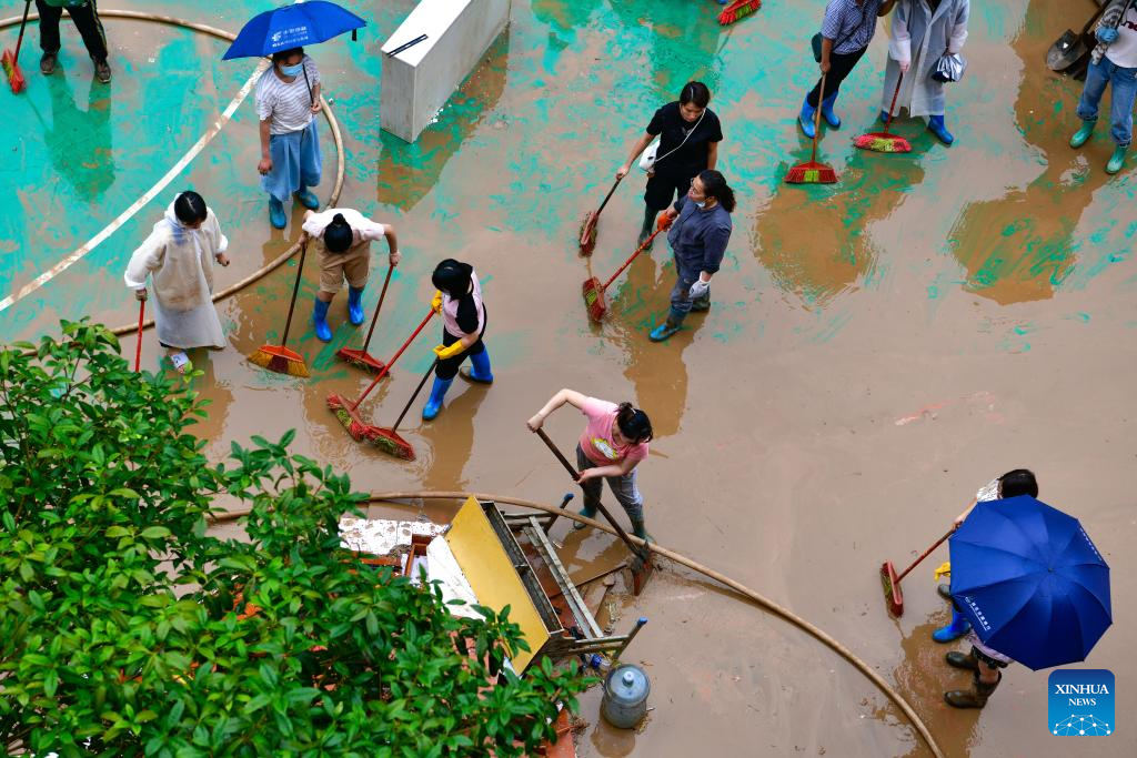 People do clean work after flood at a school in Zhenyuan County, southwest China's Guizhou Province, June 30, 2024. Parts of Zhenyuan County in Guizhou was hit by flood triggered by heavy rainfall from Friday to Saturday. (Xinhua/Yang Wenbin)