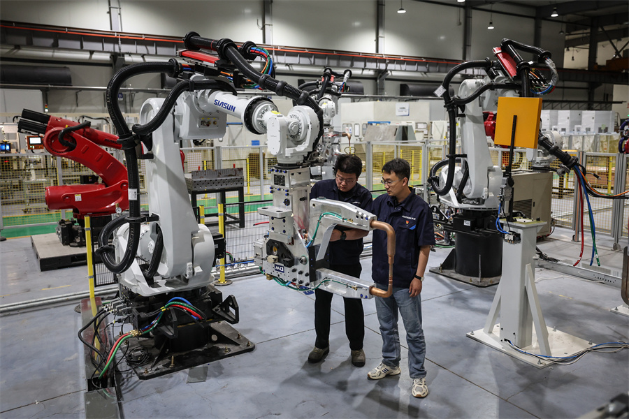 Technicians check a spot welding robot in Shenyang, Northeast China's Liaoning province, on June 3, 2024. (Photo/Xinhua)