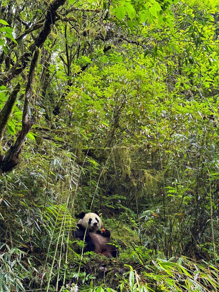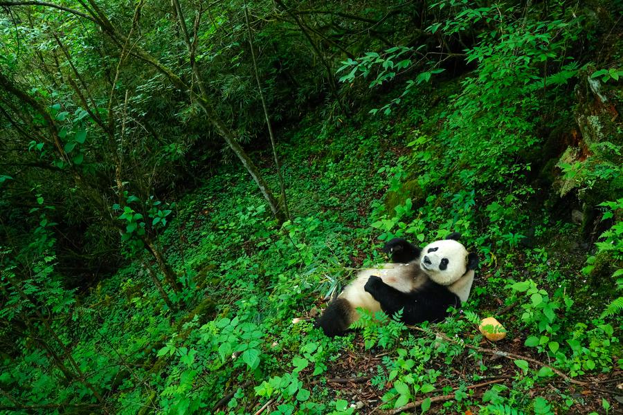 Giant panda Xian Xian has food at the second-phase giant panda wild training fields of Tiantai Mountain in Wolong National Nature Reserve in southwest China's Sichuan Province, June 24, 2024. (Xinhua/Shen Bohan)