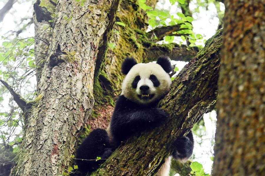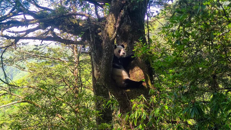Giant panda Hui Hui is seen on a tree at the second-phase giant panda wild training fields of Tiantai Mountain in Wolong National Nature Reserve in southwest China's Sichuan Province, May 22, 2024. (Photo by Mu Shijie/Xinhua)
