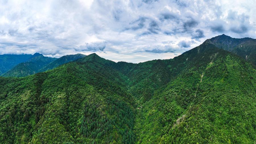An aerial drone photo taken on June 24, 2024 shows a view of giant panda wild training fields of Tiantai Mountain in Wolong National Nature Reserve in southwest China's Sichuan Province. (Xinhua/Shen Bohan)