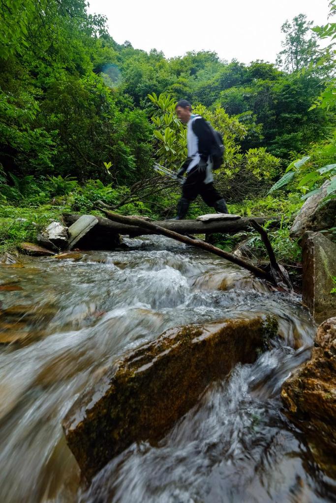 Staff member Mu Shijie prepares to patrol the giant panda wild training fields of Tiantai Mountain in Wolong National Nature Reserve in southwest China's Sichuan Province, June 24, 2024. (Xinhua/Shen Bohan)