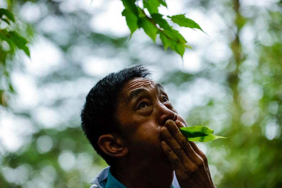 Staff member Mu Shijie uses a DIY bamboo leaf whistle to call giant panda Hui Hui out for foraging at the second-phase giant panda wild training fields of Tiantai Mountain in Wolong National Nature Reserve in southwest China's Sichuan Province, June 24, 2024. (Xinhua/Shen Bohan)