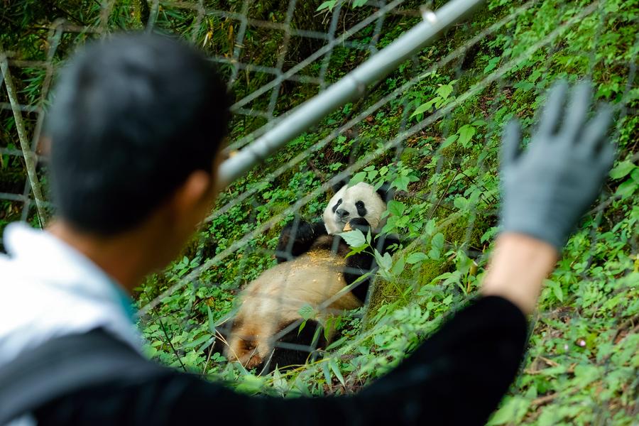Staff member Mu Shijie waves goodbye to giant panda Xian Xian after feeding her at the second-phase giant panda wild training fields of Tiantai Mountain in Wolong National Nature Reserve in southwest China's Sichuan Province, June 24, 2024. (Xinhua/Shen Bohan)