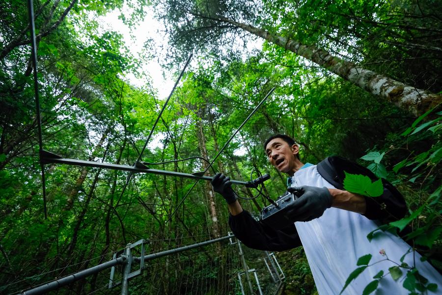 Staff member Mu Shijie uses a radio positioning device to trace giant panda Xian Xian while calling out her name at Tiantai Mountain in Wolong National Nature Reserve in southwest China's Sichuan Province, June 24, 2024. (Xinhua/Shen Bohan)