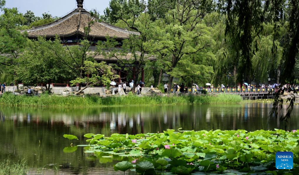 Visitors enjoy blooming lotus flowers at Yuanmingyuan Park in Beijing, capital of China, June 30, 2024. (Xinhua/Li Xin)
