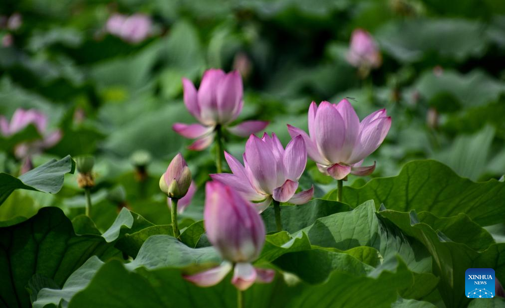 This photo taken on June 30, 2024 shows blooming lotus flowers at Yuanmingyuan Park in Beijing, capital of China. (Xinhua/Li Xin)