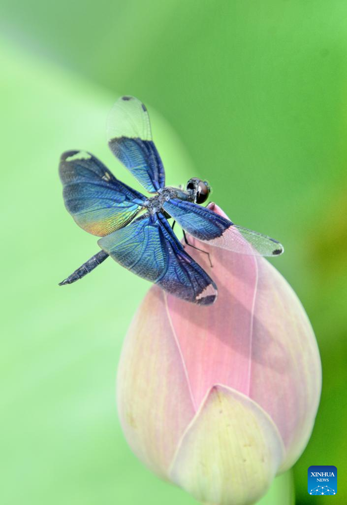 A dragonfly rests on a lotus bud at Yuanmingyuan Park in Beijing, capital of China, June 30, 2024. (Xinhua/Li Xin)