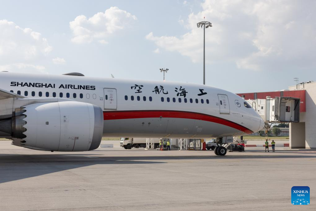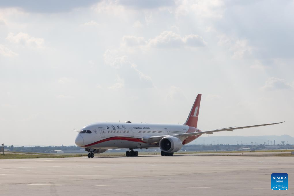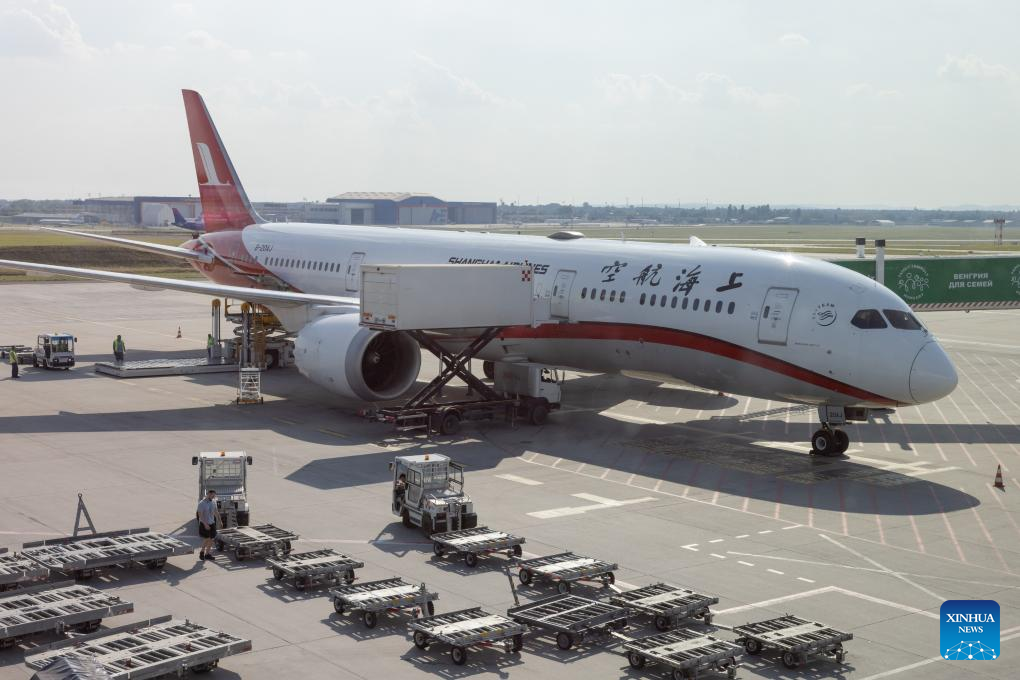 An aircraft from Xi'an, capital of northwest China's Shaanxi Province, arrives at Budapest Ferenc Liszt International Airport in Budapest, Hungary, June 29, 2024. (Photo by Attila Volgyi/Xinhua)