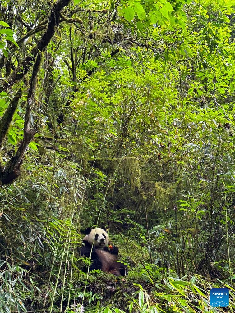 Giant panda Xian Xian has food at the second-phase giant panda wild training fields of Tiantai Mountain in Wolong National Nature Reserve in southwest China's Sichuan Province, June 24, 2024. (Xinhua/Shen Bohan)?