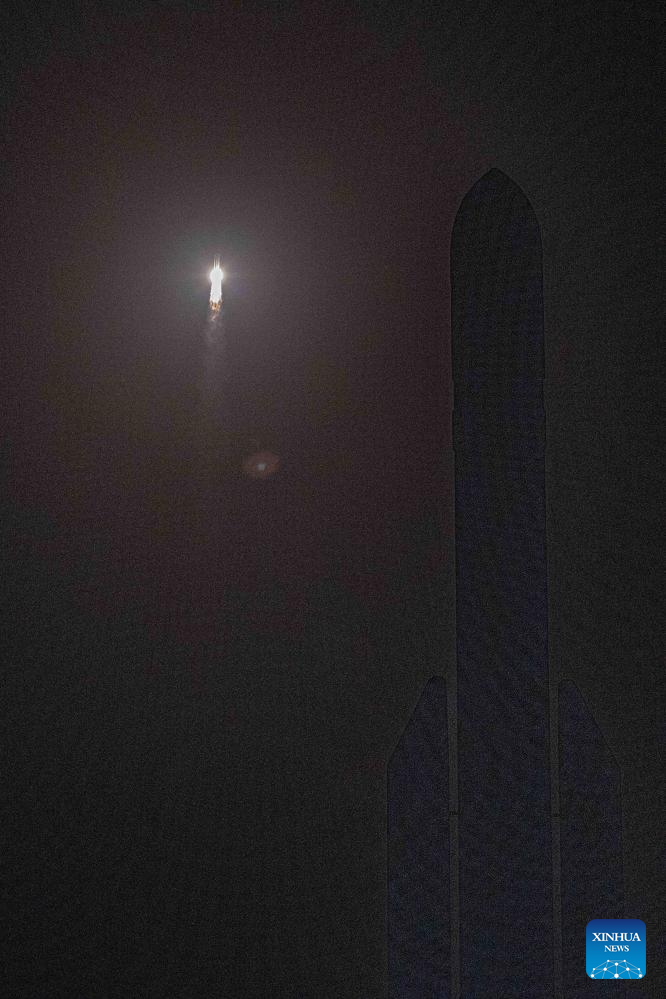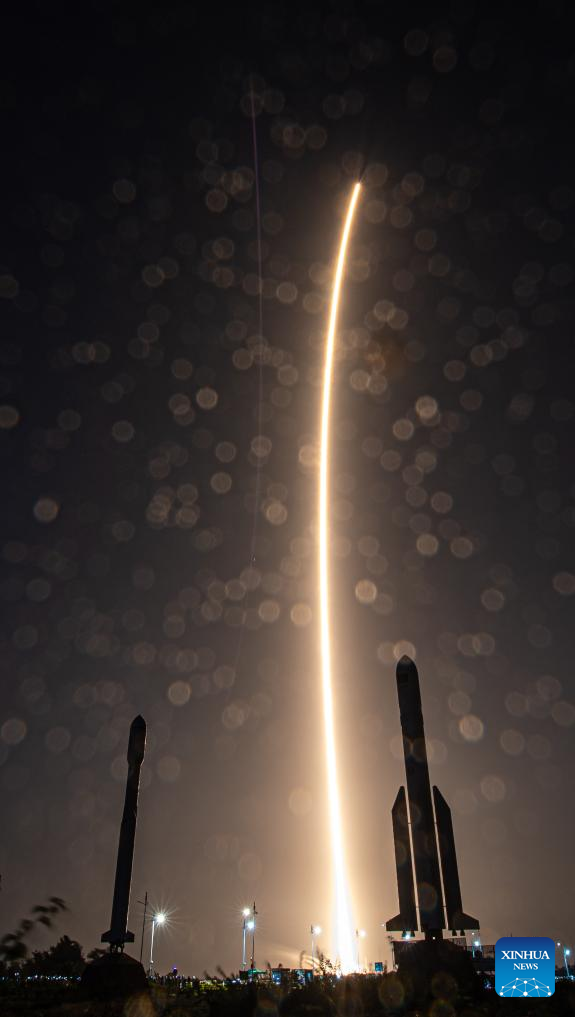 This long-exposure photo shows a modified version of the Long March-7 carrier rocket carrying the Zhongxing-3A satellite blasting off from the Wenchang Space Launch Site on the coast of southern island province of Hainan, June 29, 2024. (Xinhua/Pu Xiaoxu)