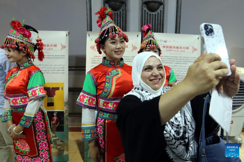 A visitor takes a selfie with actresses dressed in ethnic costumes in the China Cultural Center in Amman, Jordan on June 30, 2024. (Photo by Mohammad Abu Ghosh/Xinhua)