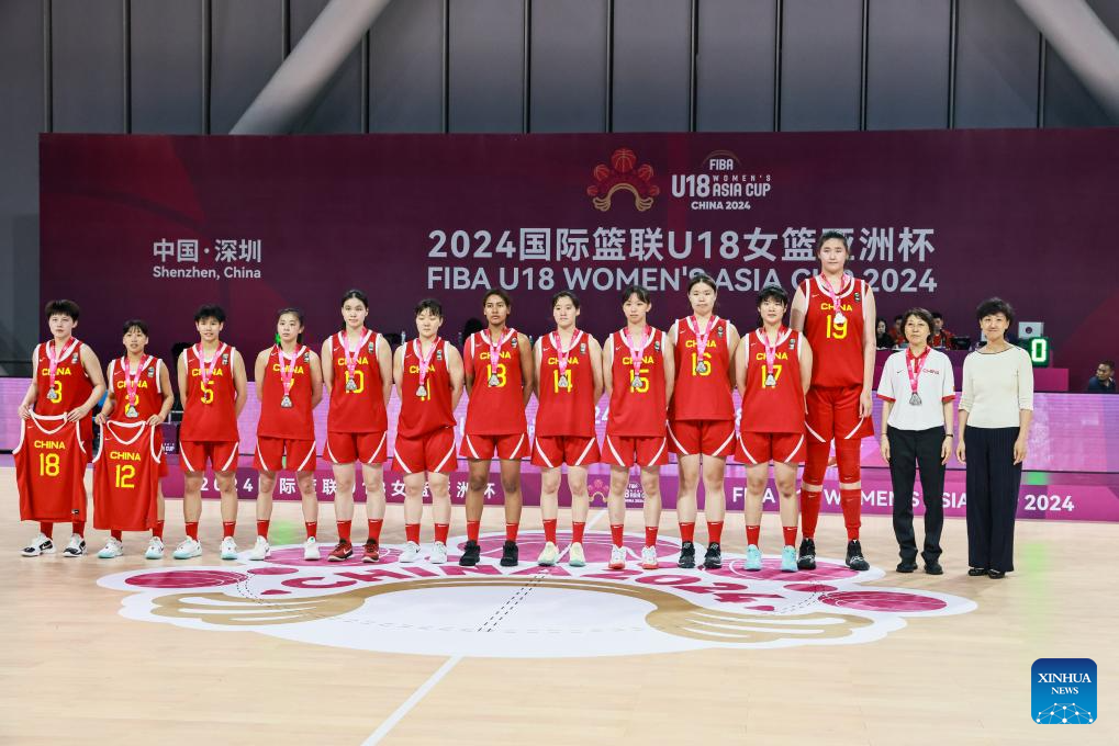 Members of team China pose for photos during the awarding ceremony for the final match between China and Australia at the FIBA U18 Women's Asian Cup 2024 in Shenzhen, south China's Guangdong Province, June 30, 2024. (Photo by Peng Zhigang/Xinhua)