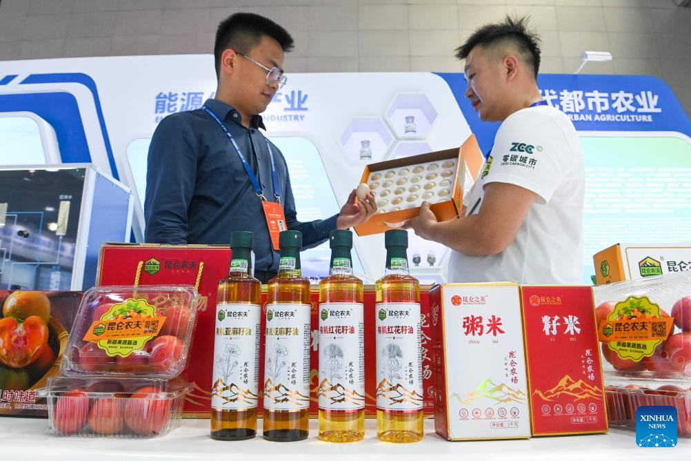 A staff member (R) introduces agricultural products to an exhibitor at the 8th China-Eurasia Expo in Urumqi, northwest China's Xinjiang Uygur Autonomous Region, June 28, 2024. Themed "New Opportunities of Silk Road, New Vitality for Eurasian Cooperation," the five-day expo that opened on June 26 has drawn over 1,900 participants from 50 countries, regions and international organizations, showcasing over 6,000 varieties of products. (Xinhua/Wang Fei)