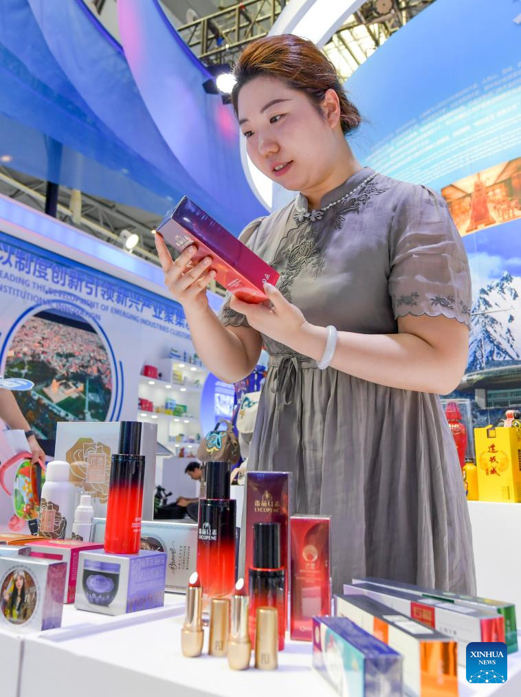 A staff member puts skincare products in place at the 8th China-Eurasia Expo in Urumqi, northwest China's Xinjiang Uygur Autonomous Region, June 26, 2024. Themed "New Opportunities of Silk Road, New Vitality for Eurasian Cooperation," the five-day expo that opened on June 26 has drawn over 1,900 participants from 50 countries, regions and international organizations, showcasing over 6,000 varieties of products. (Xinhua/Wang Fei)