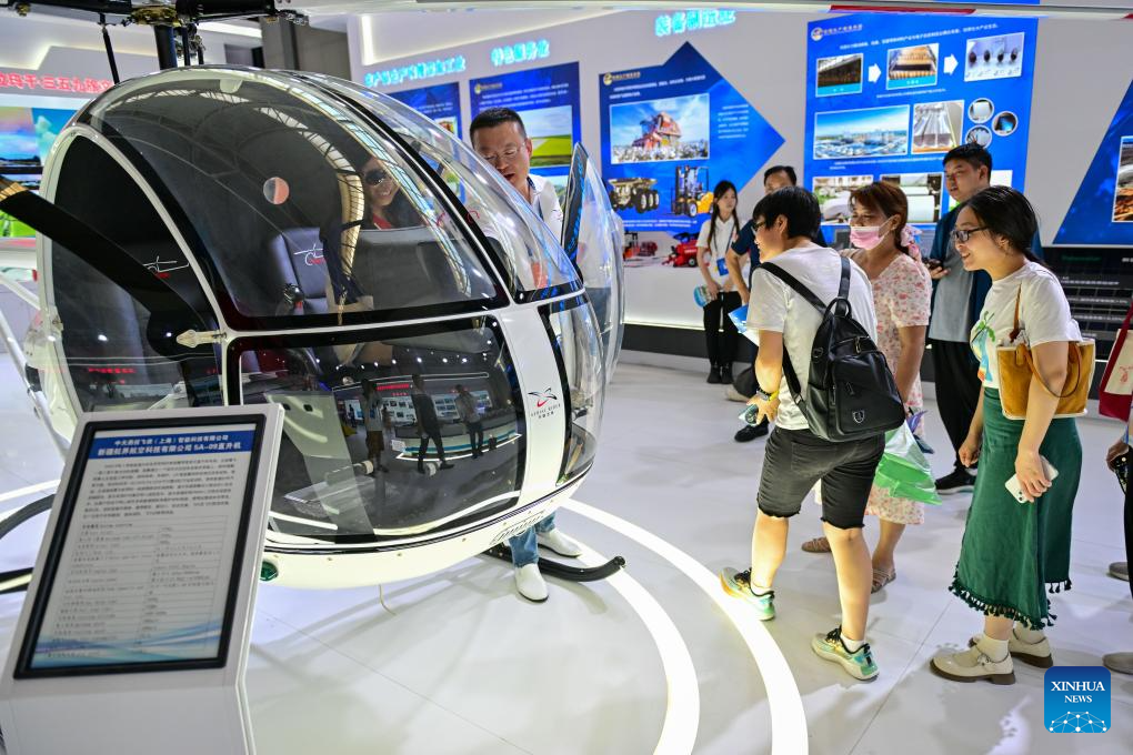 Visitors view a China-made helicopter at the 8th China-Eurasia Expo in Urumqi, northwest China's Xinjiang Uygur Autonomous Region, June 27, 2024. Themed "New Opportunities of Silk Road, New Vitality for Eurasian Cooperation," the five-day expo that opened on June 26 has drawn over 1,900 participants from 50 countries, regions and international organizations, showcasing over 6,000 varieties of products. (Xinhua/Ding Lei)
