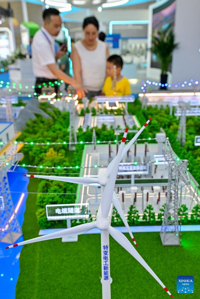Visitors learn about power facility models at the 8th China-Eurasia Expo in Urumqi, northwest China's Xinjiang Uygur Autonomous Region, June 27, 2024. Themed "New Opportunities of Silk Road, New Vitality for Eurasian Cooperation," the five-day expo that opened on June 26 has drawn over 1,900 participants from 50 countries, regions and international organizations, showcasing over 6,000 varieties of products. (Xinhua/Ding Lei)