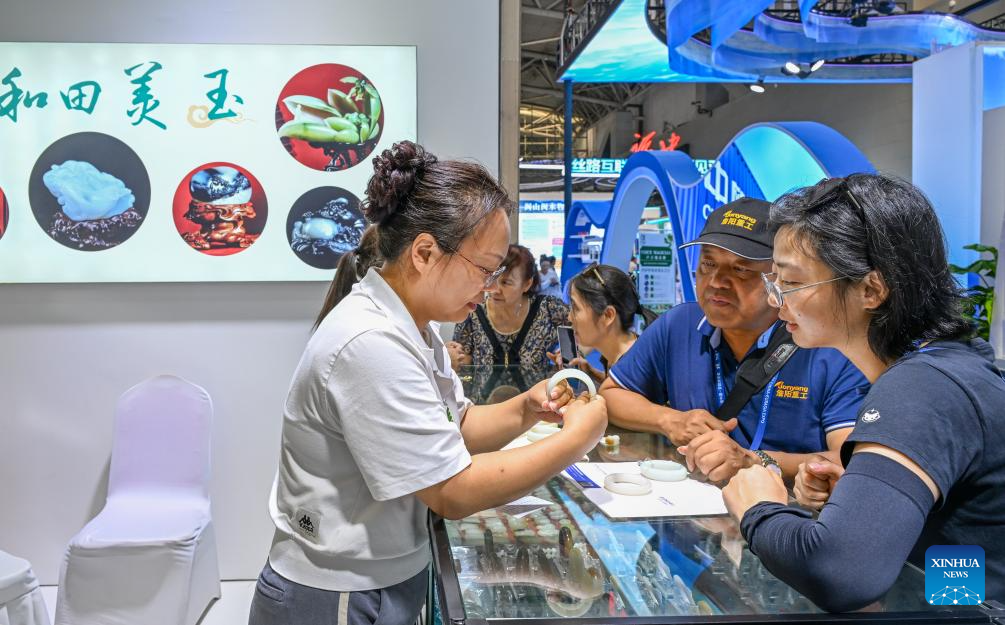 Visitors select Hotan jade at the 8th China-Eurasia Expo in Urumqi, northwest China's Xinjiang Uygur Autonomous Region, June 30, 2024. Themed "New Opportunities of Silk Road, New Vitality for Eurasian Cooperation," the five-day expo that opened on June 26 has drawn over 1,900 participants from 50 countries, regions and international organizations, showcasing over 6,000 varieties of products. (Xinhua/Chen Shuo)
