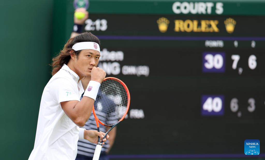 Zhang Zhizhen celebrates during the men's singles first round match between Zhang Zhizhen of China and Maxime Janvier of France at Wimbledon tennis Championship in London, Britain, on July 1, 2024. (Xinhua/Li Ying)