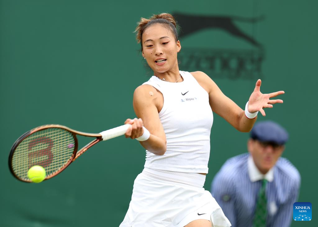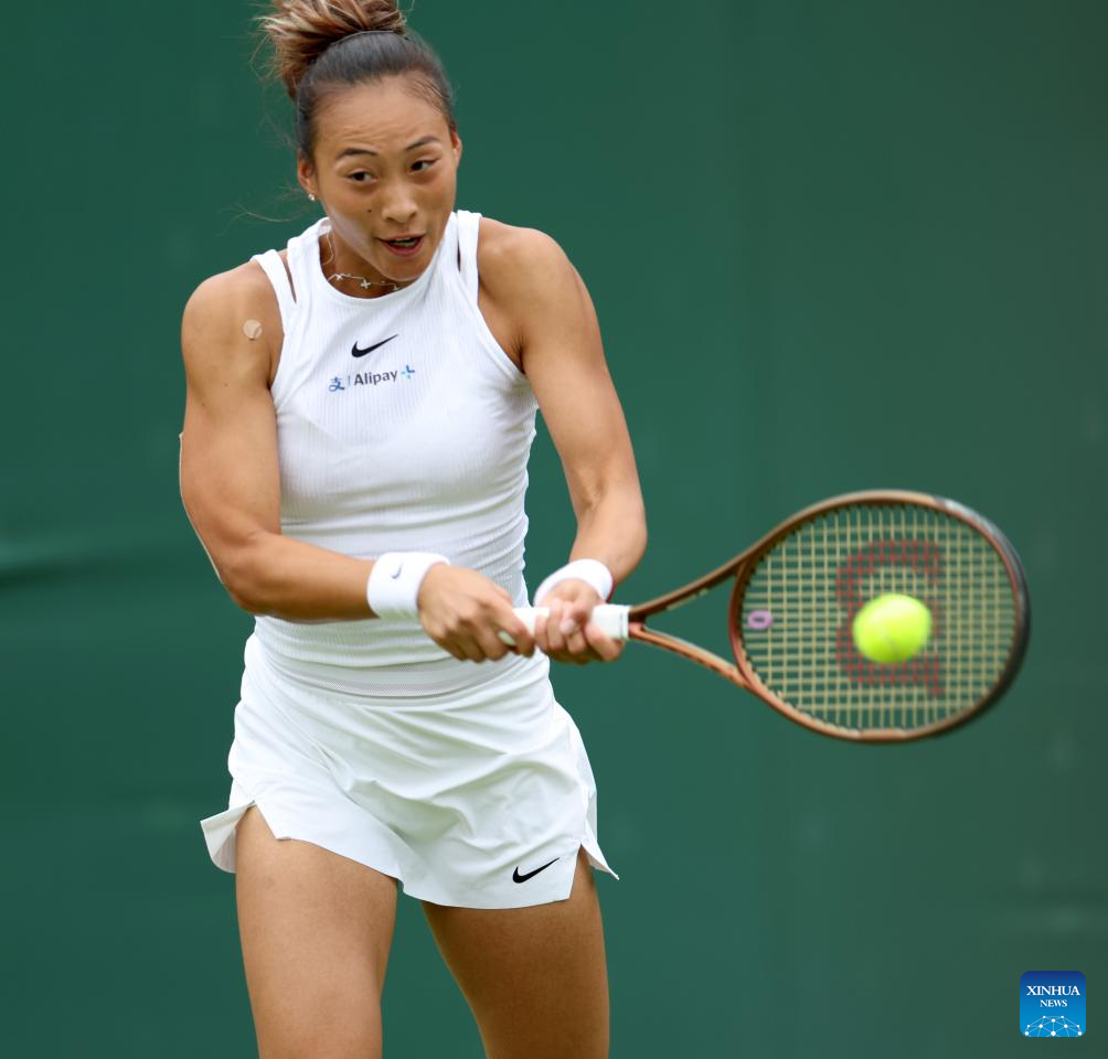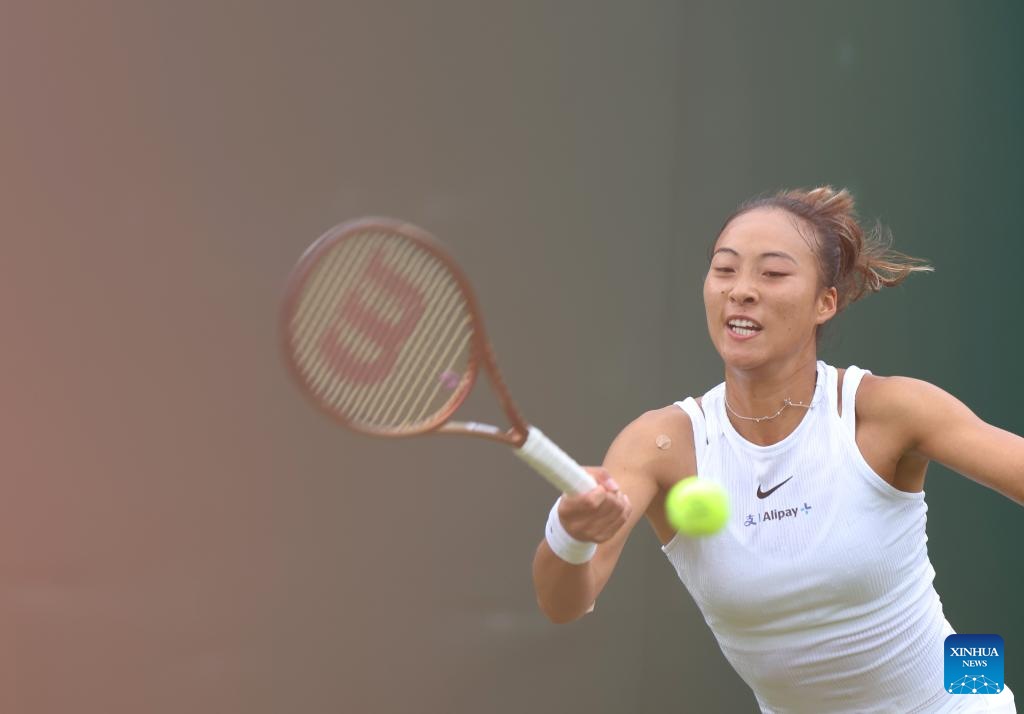 Zheng Qinwen hits a return during the women's singles first round match between Zheng Qinwen of China and Sun Lulu of New Zealand at Wimbledon tennis Championship in London, Britain, on July 1, 2024. (Xinhua/Li Ying)