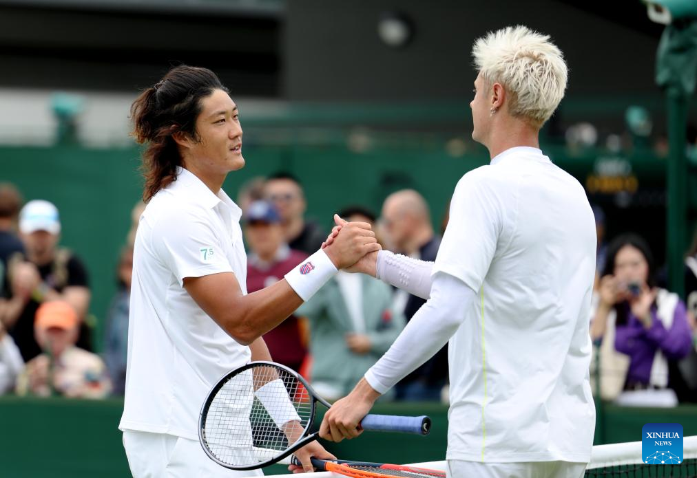 Zhang Zhizhen (L) of China greets Maxime Janvier of France after their men's singles first round match at Wimbledon tennis Championship in London, Britain, on July 1, 2024. (Xinhua/Li Ying)