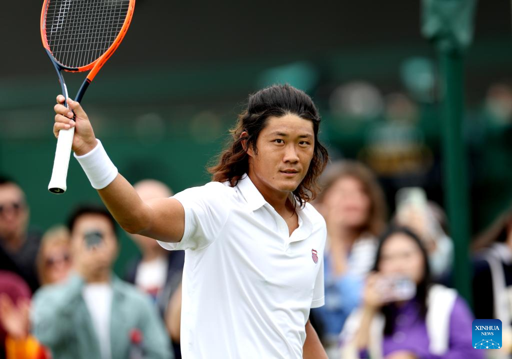 Zhang Zhizhen greets spectators after winning the men's singles first round match between Zhang Zhizhen of China and Maxime Janvier of France at Wimbledon tennis Championship in London, Britain, on July 1, 2024. (Xinhua/Li Ying)