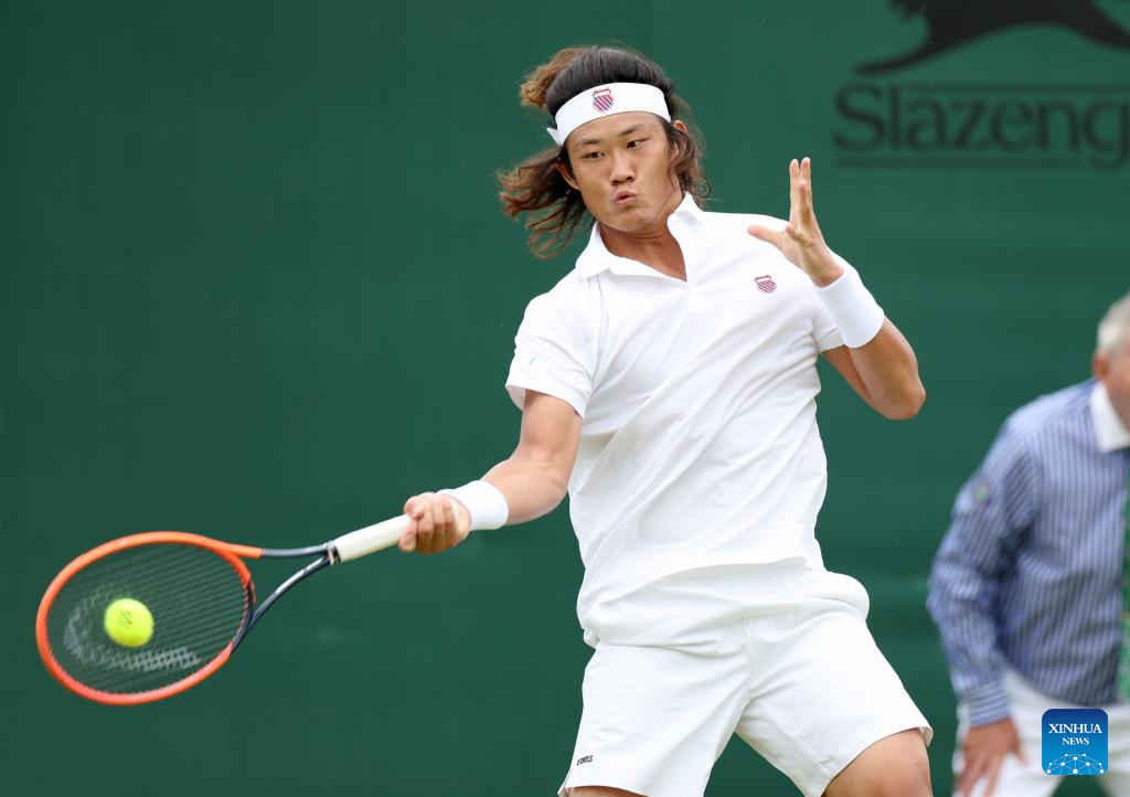 Zhang Zhizhen hits a return during the men's singles first round match between Zhang Zhizhen of China and Maxime Janvier of France at Wimbledon tennis Championship in London, Britain, on July 1, 2024. (Xinhua/Li Ying)