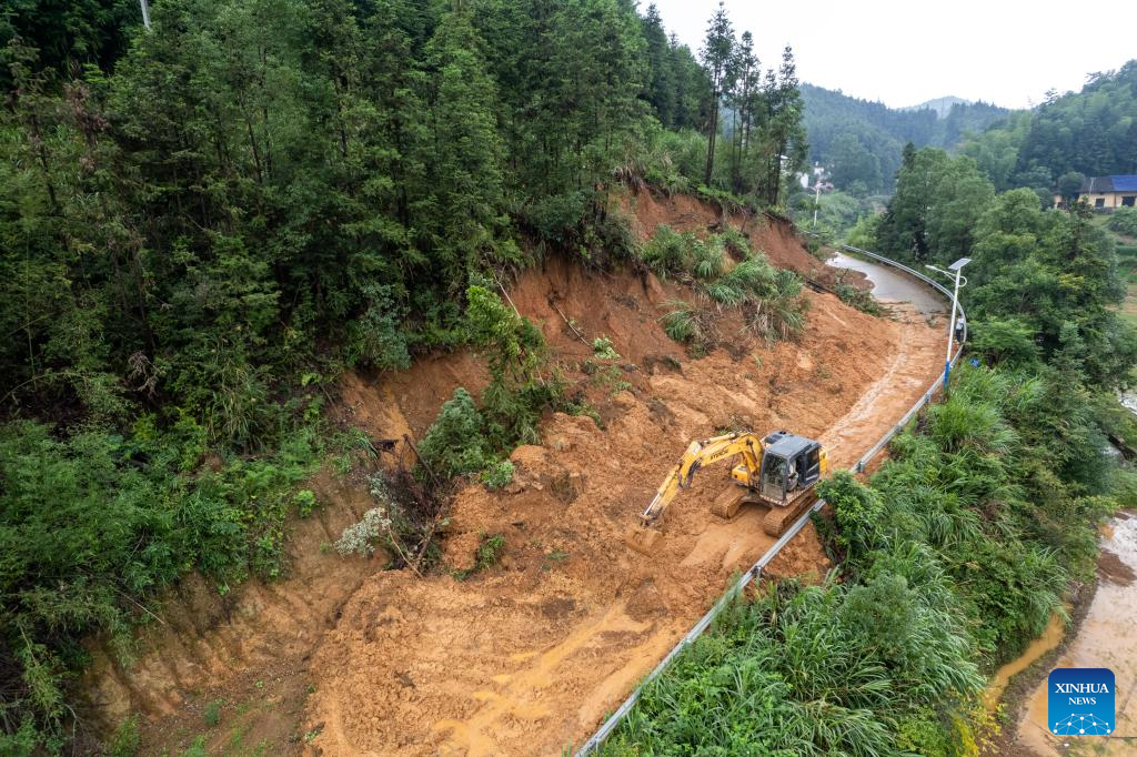An aerial drone photo shows an excavator working to restore a blocked road in Sanshi Town of Pingjiang county, central China's Hunan Province, July 2, 2024. The flooding water in Pingjiang county is gradually declining. As of 6 p.m. on July 2, the water level of Pingjiang watch station of the Miluo River was 76.18 meters, still 5.68 meters above the warning mark, but 1.49 meters lower than the peak level. (Xinhua/Chen Sihan)