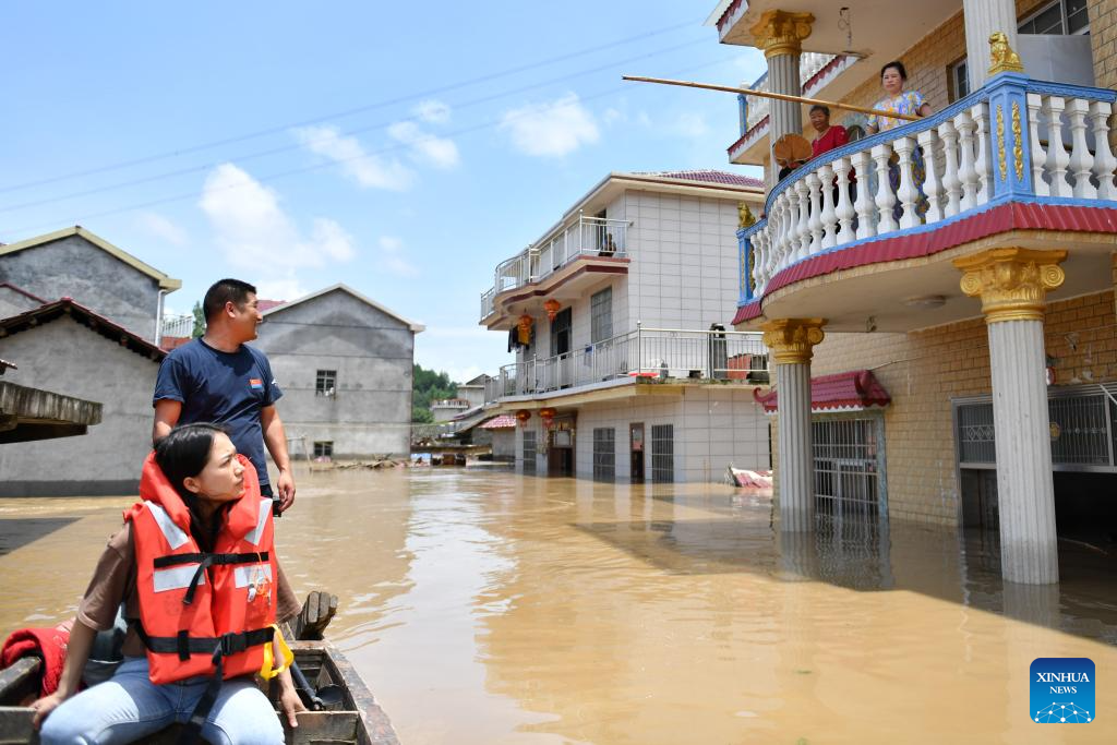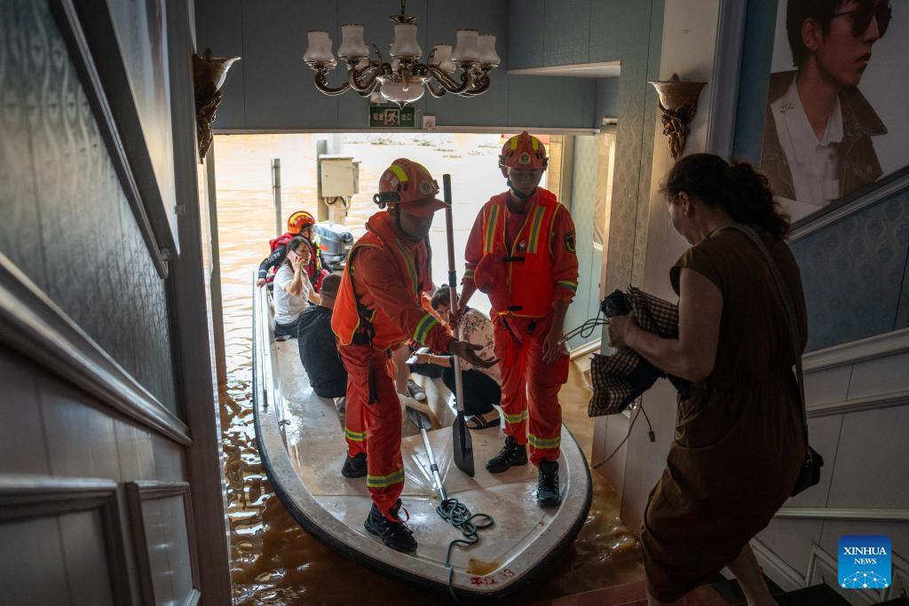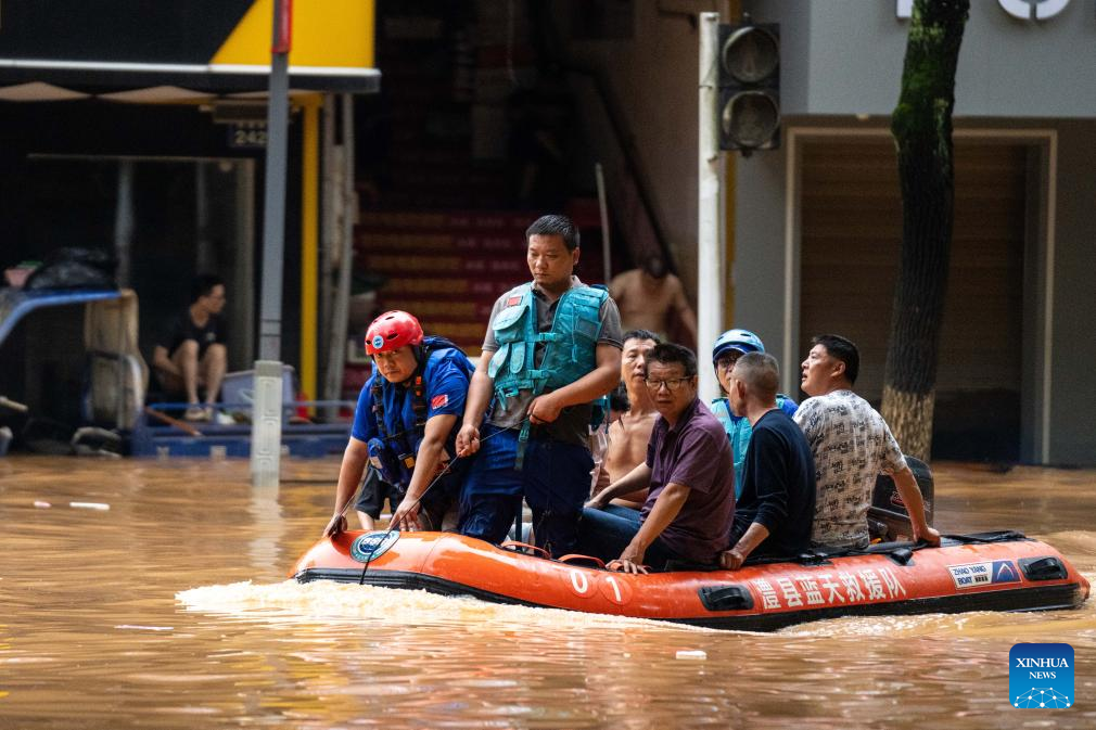Firefighters transfer stranded residents in Pingjiang county, central China's Hunan Province, July 2, 2024. The flooding water in Pingjiang county is gradually declining. As of 6 p.m. on July 2, the water level of Pingjiang watch station of the Miluo River was 76.18 meters, still 5.68 meters above the warning mark, but 1.49 meters lower than the peak level. (Xinhua/Chen Sihan)
