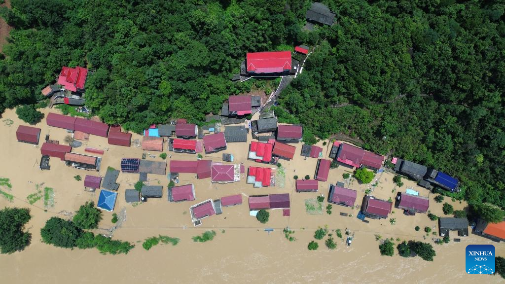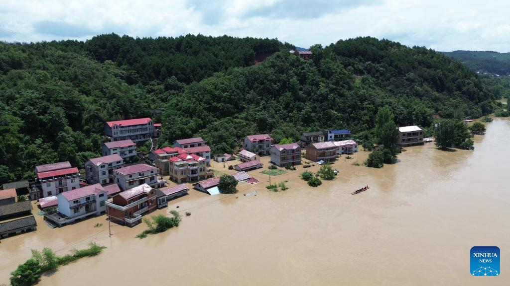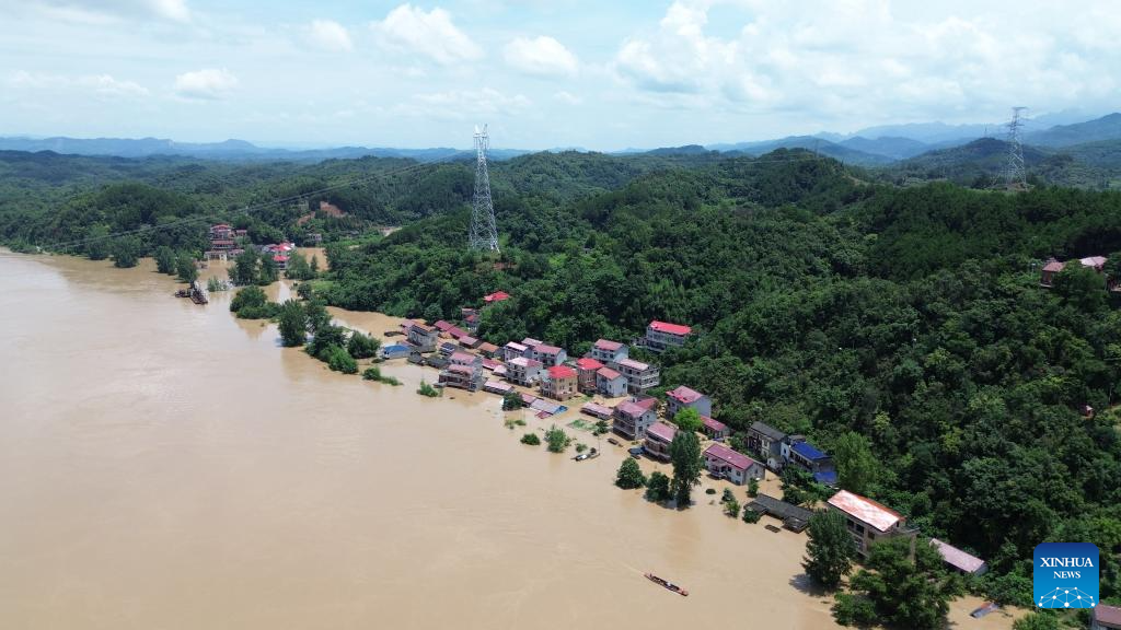 An aerial drone photo taken on July 2, 2024 shows the flooded Lujiawan Village in Chenyang Town, Chenxi County, central China's Hunan Province. (Xinhua/Chen Zhenhai)
