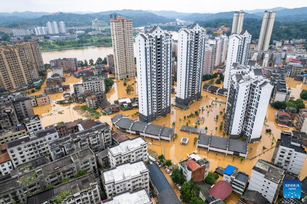 An aerial drone photo shows the waterlogged downtown of Pingjiang county, central China's Hunan Province, July 2, 2024. The flooding water in Pingjiang county is gradually declining. As of 6 p.m. on July 2, the water level of Pingjiang watch station of the Miluo River was 76.18 meters, still 5.68 meters above the warning mark, but 1.49 meters lower than the peak level. (Xinhua/Chen Sihan)