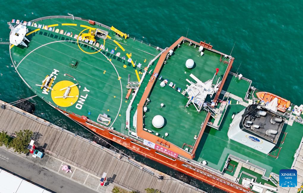 An aerial drone photo taken on July 3, 2024 shows China's icebreaker research vessel Jidi berthing at the pier of Qingdao Olympic Sailing Center in Qingdao, east China's Shandong Province. China's icebreaker Xuelong 2 and icebreaker research vessel Jidi were open to public here on Wednesday. This is also the first time for Jidi, China's independently designed and built icebreaker research vessel, to allow for public visit since its official delivery on June 24 this year.(Photo by Zhang Jingang/Xinhua)